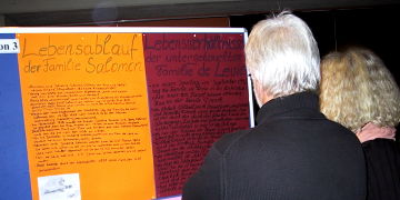 Die Teilnehmerinnen und Teilnehmer der Veranstaltung trafen sich zum Abschluss im Gebäude der Kaufmännischen Schulen der Stadt Rheine, wo eine kleine Ausstellung zum Schicksal der betroffenen jüdischen Familien besichtigt werden konnte. |