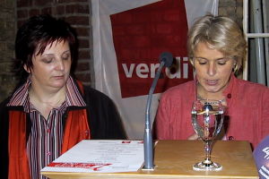 Erika Leuteritz, die Gleichstellungsbeauftragte der Stadt Emsdetten (oben rechts), verwies auf Ergebnisse von Untersuchungen auf EU-Ebene, nach denen in der Bundesrepublik Deutschland Frauen im Berufsleben deutlich stärker benachteiligt sind als in den meisten übrigen EU-Ländern. Aus aktuellem Anlass sprach sie sich gegen die von der Landesregierung beschlossenen Kürzungen im sozialen Bereich aus, die beispielsweise dazu führten, dass im Frauenhaus Rheine eine der beiden bisher dort beschäftigten Sozialarbeiterinnen entlassen werden müsse.