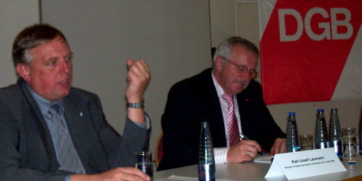 Die "Zukunft der Ausbildungs- und Arbeitsplätze im Münsterland" wollten die DGB-Ortsverbände Rheine, Ibbenbüren und Lengerich mit Karl-Josef Laumann (CDU), dem Minister für Arbeit, Gesundheit und Soziales des Landes Nordrhein-Westfalen nach eineinhalb Regierungsjahren der scEin zeitweise kämpferischer Minister und ein nachdenklicher Gewerkschaftsvorsitzender: Karl-Josef Laumann (CDU) und DGB-Regionalvorsitzender Bernhard Tenhofen diskutierten über die Zukunft der Ausbildungs- und Arbeitsplätze im Münsterland.hwarz-gelben Koalition diskutieren. Bernhard Tenhofen, Vorsitzender der DGB-Region Münsterland, regte bei der Begrüßung der im TaT erschienenen Gäste an, dabei auch auf das aktuelle Thema "Neue Armut" einzugehen.