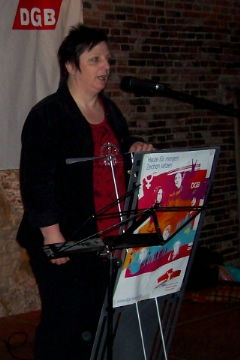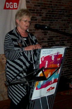Die diesjährige DGB-Veranstaltung zum "Internationalen Frauentag" wurde von der Vorsitzenden des Regions-frauenausschusses Münsterland, Karin Toniazzo (links), eröffnet, die aus-drücklich auch die anwesenden Männer begrüßte: "Wir diskriminieren niemanden." Kollegin Monika Hölzel, Gleichstel-lungsbeauftragte der Stadt Rheine (rechts), ging in ihrem Grußwort auf die hundertjährige Geschichte des Internationalen Frauentages ein und belegte mit konkreten Zahlen, dass der grundgesetzliche Anspruch auf Gleichbehandlung der Geschlechter in der Arbeitswelt noch lange nicht erreicht ist. |