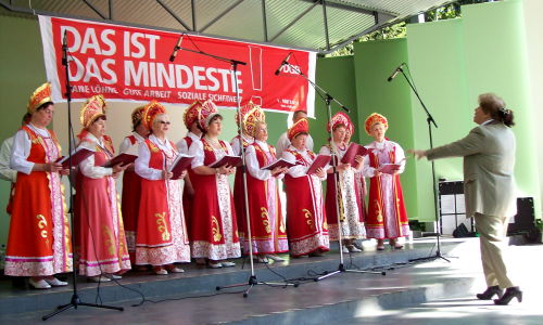 Maifeier 2011 des DGB-Ortsverbandes Rheine wieder im Stadtpark, aber mit neuer kultureller Umrahmung durch den Chor "Kalinka"