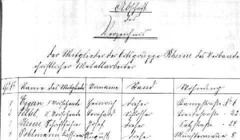 Das Mitgliederverzeichnis umfasste 33 Personen, sämtlich Männer, deren Berufe sich folgendermaßen aufgliederten: 18 von ihnen waren Schlosser, acht Dreher und je einer Klempner und Fräser. Nur fünf Mitglieder - vier Arbeiter und ein Heizer - waren ungelernte Kräfte. Von den Mitgliedern wohnten 31 im Stadtgebiet links der Ems, eins im Stadtgebiet rechts der Ems (Lingener Straße) und eins in der Feldmark Dutum. |